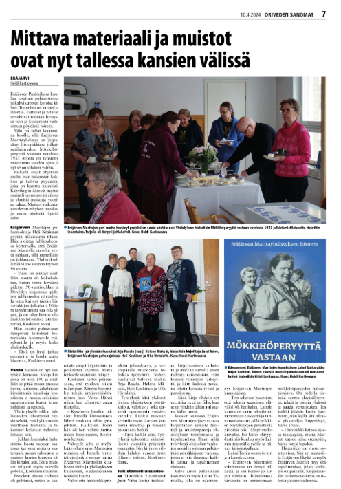 Vanha historia on nyt kuitenkin kansissa. Sivuja kirjassa on noin 190 ja se pitää sisällään kuvia, tarinoita, aikalaisten kirjoittamia hauskoja kronikoita ja runoja erilaisista tapahtumista, kuten kruunuhäistä ja retkistä. Yhdistykselle olikin juhlavuoden lähestyessä täysin selvää, että kylän omien marttojen toiminta ja tekemiset halutaan tallentaa kirjaksi asti.