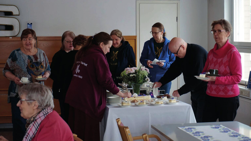 Paikalla olijat ohjataan melko pian hakemaan kakkua ja kahvia pöydästä, joka on katettu kauniisti. Kahvikuppien ääressä, martat muistelivat menneitä aikoja ja yhteisiä muistoja vuosien takaa. Muistot vaikuttavat olevan erityisen hauskoja. Nauru nimittäin täyttää koko salin.